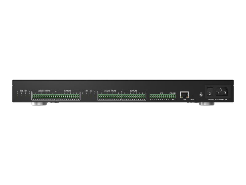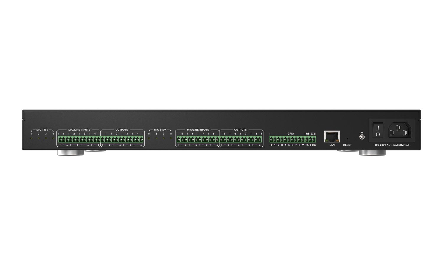 Flexibilní řešení pro zpracování zvukového signálu v profesionálních AV instalacích. Díky vyvážené zvukové matici 8×8 může směrovat zvuk přesně podle potřeb místnosti nebo aplikace. Zařízení obsahuje všechny klíčové nástroje DSP: AEC (potlačení ozvěny), ANS (potlačení šumu), AGC (automatické řízení hlasitosti) a automatický mixér, který automaticky ovládá více mikrofonů bez nutnosti ručního zásahu.
