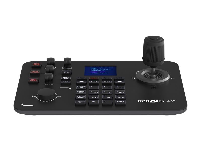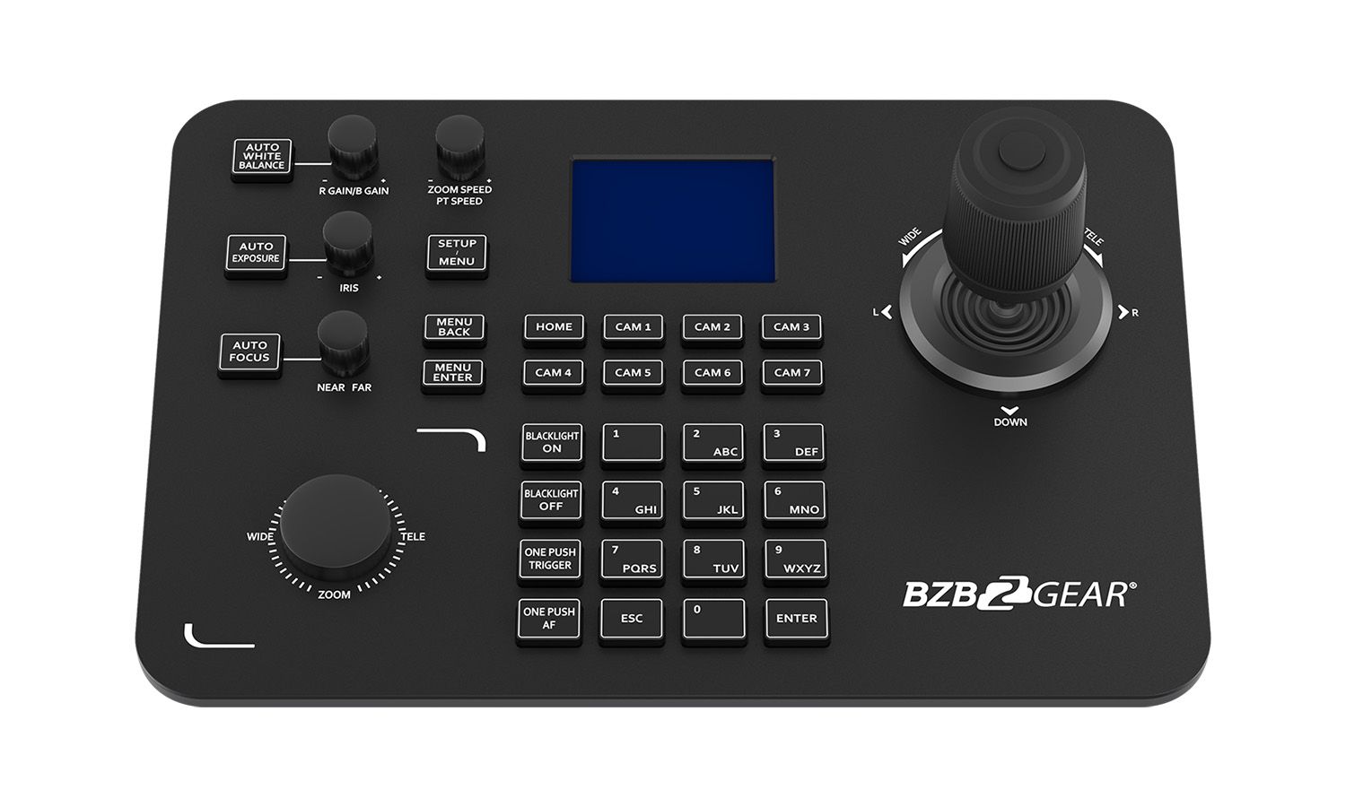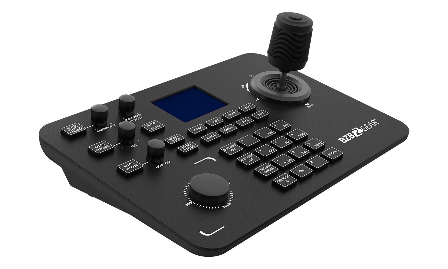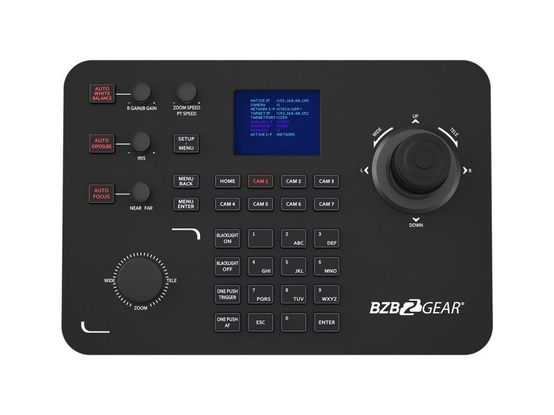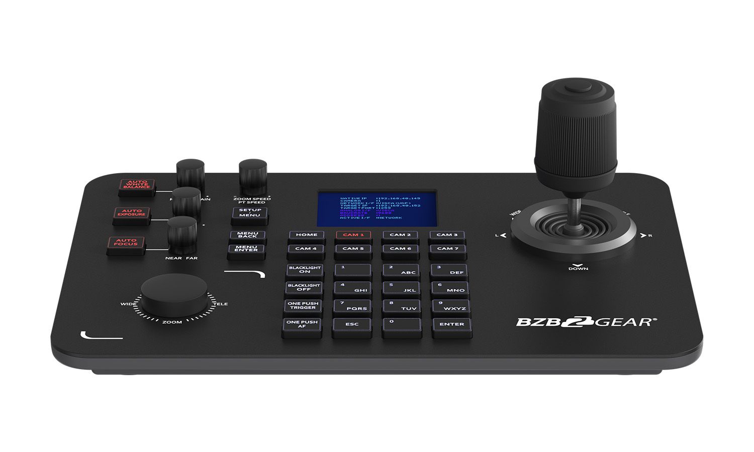 Pokročilý joystickový ovladač navržený pro efektivní a přesné ovládání kamer PTZ v profesionálních instalacích. Podporuje protokoly IP (přes síť LAN s PoE) i tradiční sériová připojení (RS232, RS422, RS485), takže je kompatibilní s většinou kamer PTZ na trhu. Řídicí jednotka podporuje nejpoužívanější protokoly včetně IP VISCA, RS-232 VISCA, Pelco-D a Pelco-P, což zajišťuje maximální flexibilitu v různých typech projektů - od jednoduchých zasedacích místností až po složitá studiová prostředí. Pohodlné ovládání zajišťuje ergonomický joystick, otočný ovladač zoomu/ostření a intuitivní tlačítka pro přepínání mezi kamerami, aktivaci předvoleb a navigaci v nabídce. Velkou výhodou je barevný displej LCD, který zobrazuje aktuální nastavení a stav připojení.