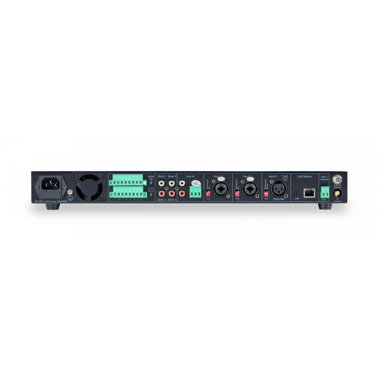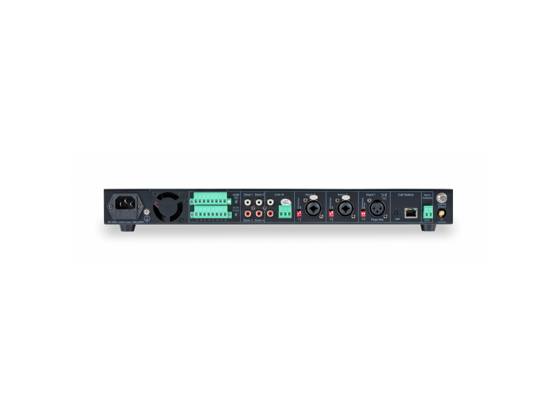 | Output signal | 4 x RCA (mono), 2x Euro-block terminal outputs (70V/100V / 4Ohms) |