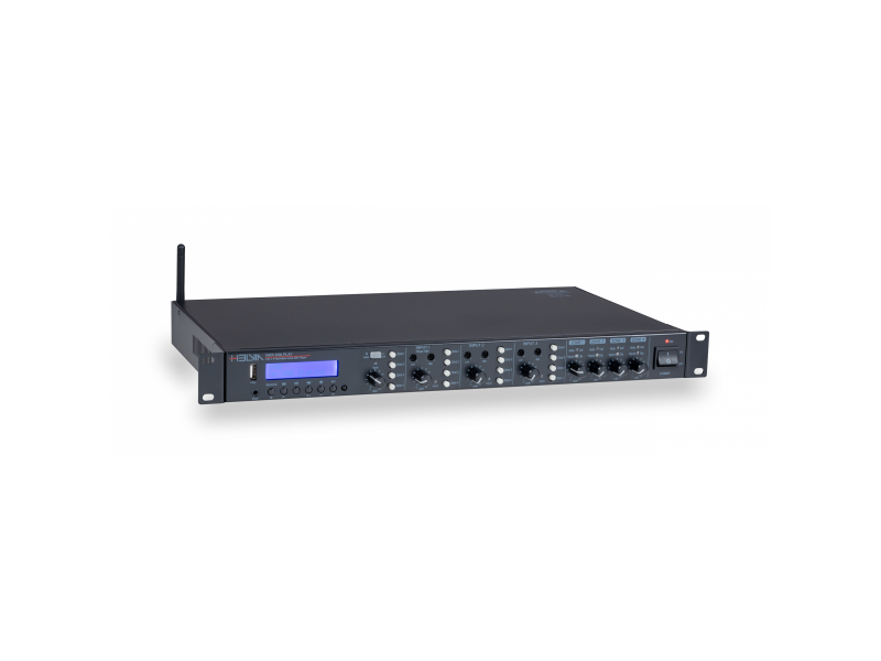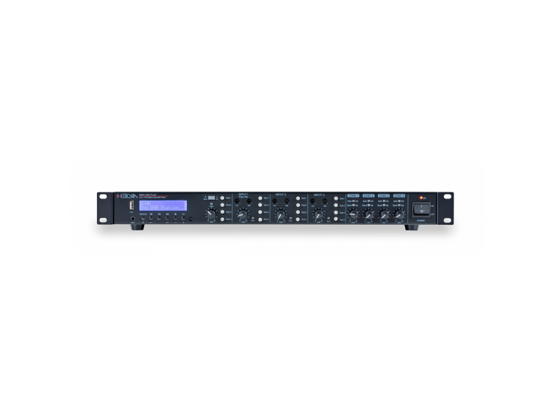 HMX-44A je univerzální „all-in-one“ řešení pro ozvučení malých a středních prostor. V jediném zařízení (1U rack) kombinuje metrixový přepínač, mixážní pult, multimediální přehrávač a čtyři nezávislé zesilovače.
