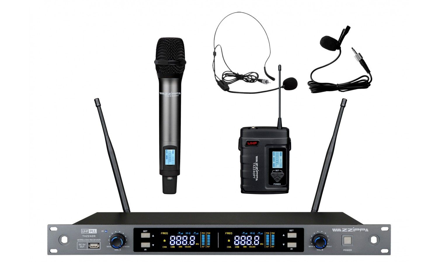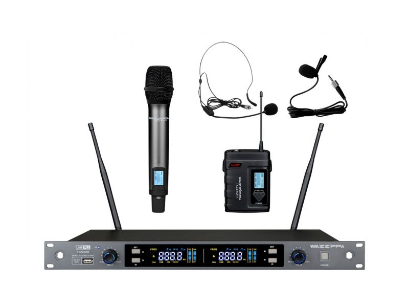 TXZZ424 je dodáván s přijímačem, jedním ručním mikrofonem a jedním bodypack vysílačem, který umožňuje připojení klopového (lavalier) mikrofonu nebo náhlavního headset mikrofonu.